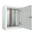 Стальной электрический щит IP31 с оцинкованной монтажной панелью, на которую установлена медная заземляющая полоса. Корпус стандартной комплектации: IP-31. Ящик выполнен из холодно-катанного тонколистового стального листа толщиной 1 мм. Конструкция ящика цельносварная, задняя стенка имеет четыре отверстия d=8 мм, передняя дверь оснащена точечным замком. В нижней части шкафа имеются три круглых отверстия d=32 мм для заведения кабеля заземления. Медная шина расположена вертикально, имеет два ряда по 15 отверстий, крепится через изоляторы SM-35 на оцинкованную монтажную панель. Шина укомплектована винтами М6х12 и гайками с фланцем с насечкой М6.