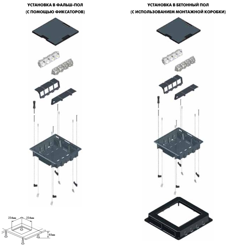 Главная / Каталог / Колонны и люки напольные / Люки для розеток в пол и в стол / Люк для розеток в полу под покрытие / Люк напольный Efapel / 83058 Коробка под заливку для люка на 16 модулей (