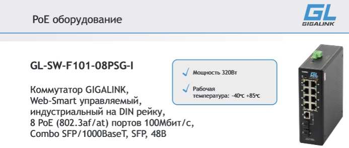 Главная / Каталог / Активное сетевое оборудование / GIGALINK / Индустриальные решения / Коммутаторы PoE Fast Ethernet Managed / GL-SW-F101-08PSG-I Коммутатор GIGALINK, Web-Smart