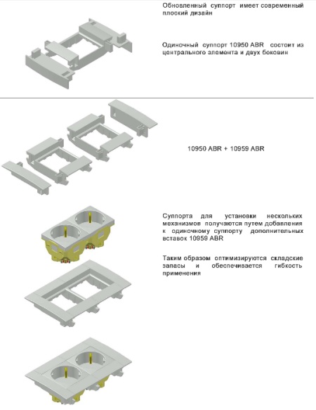 ![]() Аксессуары к кабель каналу 100х50 10090 EFAPEL 10091 RBR Т-образный отвод для короба 110х50 10092 RBR Внутренний угол для короба 110х50 10093 RBR Плоский угол для короба 110х50 10094 RBR Соединительная скоба для короба 110х50 10095 RBR Заглушка для короба 110х50 10096 RBR Внешний угол для короба 110х50 10098 ABR Переходник на меньшее сечение для короба 110х50 10099 R Перегородка для короба 10090 RBR Возможность установки новых суппортов позволяет легко и просто использовать в одном рабочем месте любое количество электротехнических изделий стандарта Mosaic, далее на схеме изображен новый суппорт и простота наращивания постов в одном суппорте. ![]() ![]() И вариант со стандартными суппортами для кабель канала с крышкой 60мм и 75 мм. на 1 пост суппорт 10986 ABR для кабель-каналов с крышкой 60 мм и 75 мм на 2 поста суппорт 10952 ABR для кабель- каналов с крышкой 75 мм на 3 поста суппорт 10954 ABR для кабель каналов с крышкой 75 мм ![]() Как правило устанавливаются следующие электротехнические изделия. силовая розетка 220В серия Mosaic : 45131 SBR EFAPEL (Португалия) силовая розетка с заземляющими контактами 851104 силовая розетка Экопласт (Россия - в целях экономии сметы на проект)