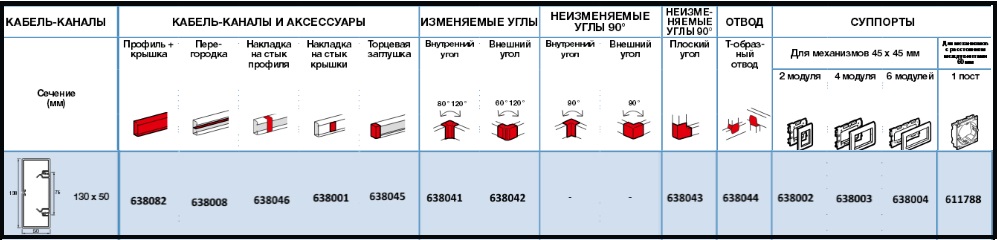 Таблица аксессуаров для Кабель Канала 130x50 арт. 638082 LEGRAND METRA УСТАНОВОЧНЫЙ ![]() Аксессуары к кабель каналу серии METRA 638082 130x50 LEGRAND 638082 130x50 Кабель канал Legrand Metra 638008 Перегородка 638046 130x50 Накладка на стык профиля 638001 130x50 Накладка на стык крышки 638045 130x50 Заглушка торцевая 638041 130x50 Внутренний угол Изменяемый 60-120° 638042 130x50 Внешний угол Изменяемый 60-120° 638043 130x50 Плоский угол 638044 130x50 Отвод Т-образный Пример: Схема монтажа Кабель-Канала LEGRAND METRA ![]()